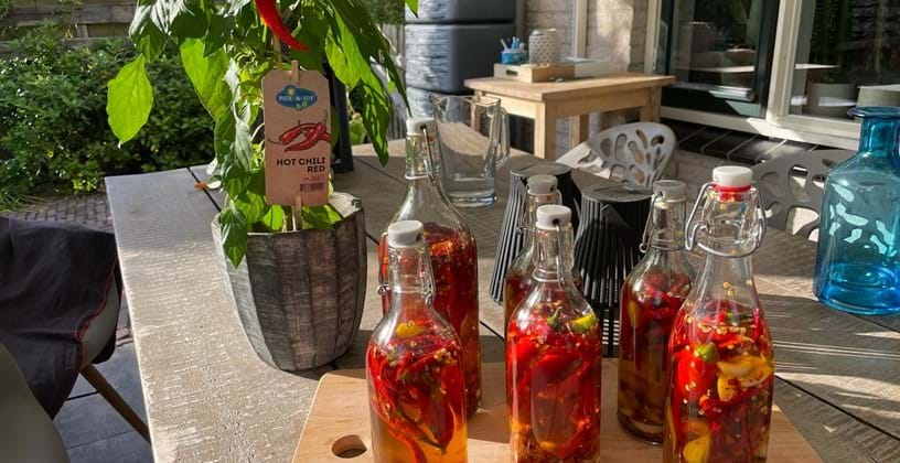 Place the Hot Chili Yellow, Hot Chili Red, and chili flakes in a pan. Cut the unpeeled garlic in half and add them to the peppers. Then, add the olive oil and heat the mixture for about 5 minutes. Strain the oil and place the chili peppers, chili flakes, and garlic in a bottle. Finally, add the warm oil to the bottle and let it infuse for at least one night. Enjoy your homemade chili oil!